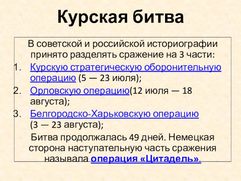 Битва продолжалась 49 дней. Немецкая сторона наступательную часть сражения называла операция «Цитадель».
