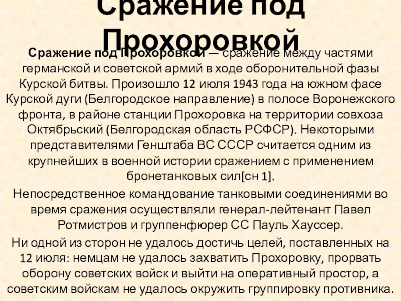 Произошло 12 июля 1943 года на южном фасе Курской дуги (Белгородское направление) в полосе Воронежского фронта, в районе станции Прохоровка на территории совхоза Октябрьский (Белгородская область РСФСР). Некоторыми представителями Генштаба ВС СССР считается одним из крупнейших в военной истории сражением с применением бронетанковых сил[сн 1].