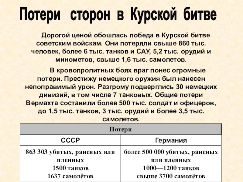 потеряли свыше 860 тыс. человек, более 6 тыс. танков и САУ, 5,2 тыс. орудий и минометов, свыше 1,6 тыс. самолетов.
