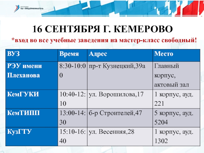 16 СЕНТЯБРЯ Г. КЕМЕРОВО *вход во все учебные заведения на мастер-класс свободный!
