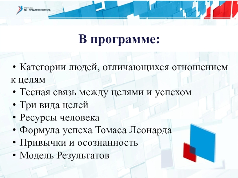 В программе:Категории людей, отличающихся отношением к целям Тесная связь между целями и успехомТри вида целейРесурсы человекаФормула успеха