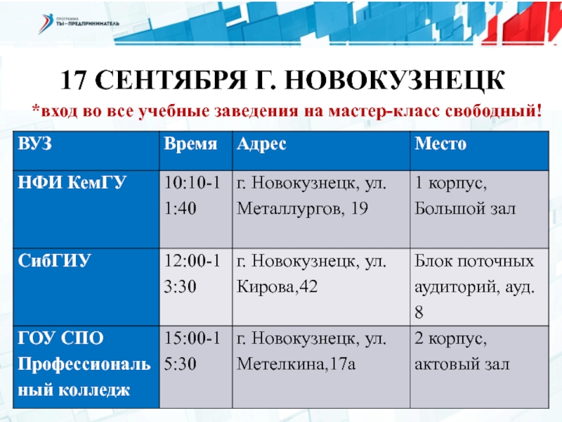 17 СЕНТЯБРЯ Г. НОВОКУЗНЕЦК*вход во все учебные заведения на мастер-класс свободный!