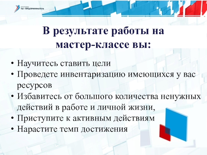 В результате работы на мастер-классе вы:Научитесь ставить целиПроведете инвентаризацию имеющихся у вас ресурсовИзбавитесь от большого количества ненужных действий