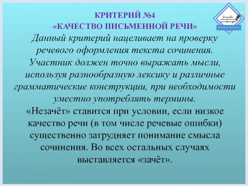 «Незачёт» ставится при условии, если низкое качество речи (в том числе речевые ошибки) существенно затрудняет понимание смысла сочинения. Во всех остальных случаях выставляется «зачёт».