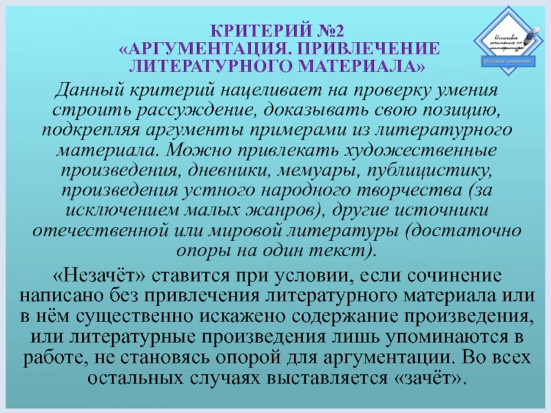 Данный критерий нацеливает на проверку содержания сочинения.