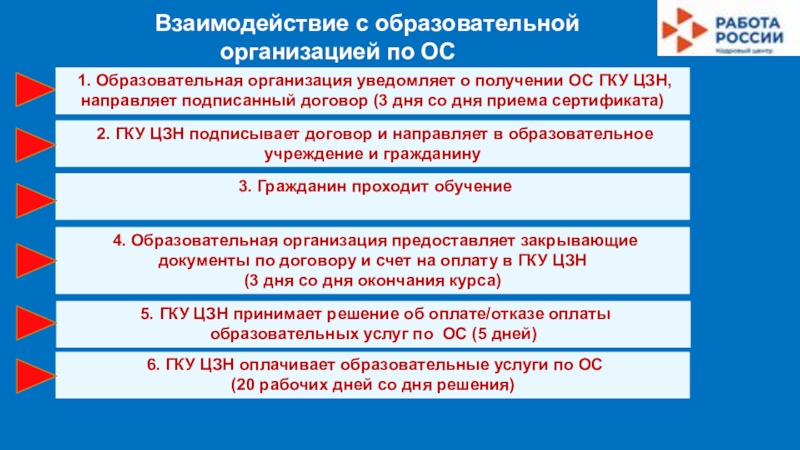 4. Образовательная организация предоставляет закрывающие документы по договору и счет на оплату в ГКУ ЦЗН