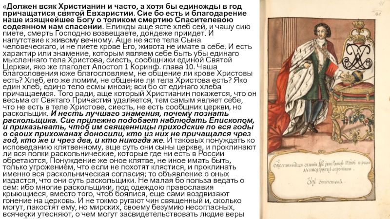 изящнейшее Богу о толиком смертию Спасителевою содеянном нам спасении. Елижды аще ясте хлеб сей, и чашу сию пиете, смерть Господню возвещаете, дондеже приидет. И напутствие к живому вечному. Аще не ясте тела Сына человеческаго, и не пиете крове Его, живота не имате в себе. И есть характир или знамение, которым являем себе быть убы единаго мысленнаго тела Христова, сиесть, сообщники единой Святой Церкви, яко же глаголет Апостол 1 Коринф. глава 10. Чаша благословения юже благословляем, не общение ли крове Христовы есть? Хлеб, его же ломим, не общение ли тела Христова есть? Яко един хлеб, едино тело есмы мнози; вси бо от единаго хлеба причащаемся. Того ради, аще который Христианин покажется, что он весьма от Святаго Причастия удаляется, тем самым являет себе, что не есть в теле Христове, сиесть, не есть сообщник церкви, но раскольщик. И несть лучшаго знамения, почему познать раскольщика. Сие прилежно подобает наблюдать Епископом, и приказывать, чтоб им священницы приходские по вся годы о своих прихожанах доносили, кто из них не причащался чрез год, кто же и чрез два, и кто никогда же. И таковых понуждать ко исповеданию клятвенному, аще суть они сыны церкве, и проклинают ли вся полки раскольнические, которые где ни есть в России обретаются, Понуждение же оное клятве, не иное имать быть, только угрожением, что если не похотят клястися, и проклинать именно вся раскольническая согласия; то объявление о оных издастся, что они суть раскольщики. Не малая бо польза ведать о сем: ибо многие раскольщики, под одеждою православия крыющиеся, вместо того, чтоб боялися, еще сами воздвизают гонение на церковь. И не токмо ругают чин священный и, сколько могут, пакостят ему, но мирских, своему безумию несогласных, всячески утесняют, о чем могут засвидетельствовать людие веры достойнии».