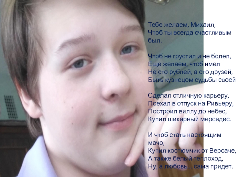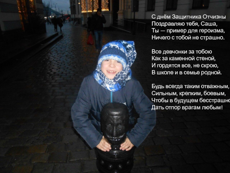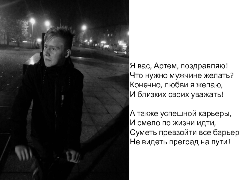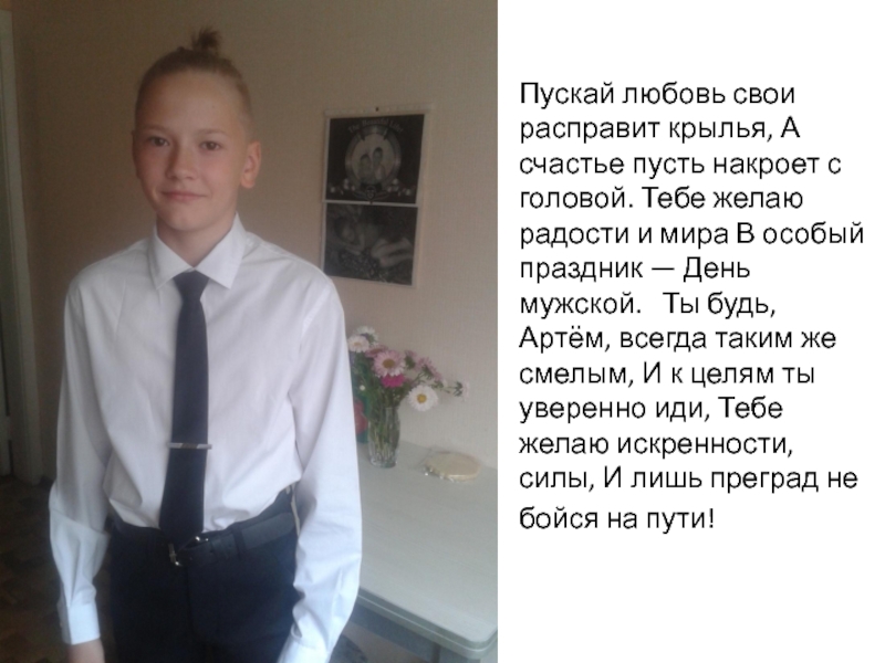 День мужской. Ты будь, Артём, всегда таким же смелым, И к целям ты уверенно иди, Тебе желаю искренности, силы, И лишь преград не бойся на пути!