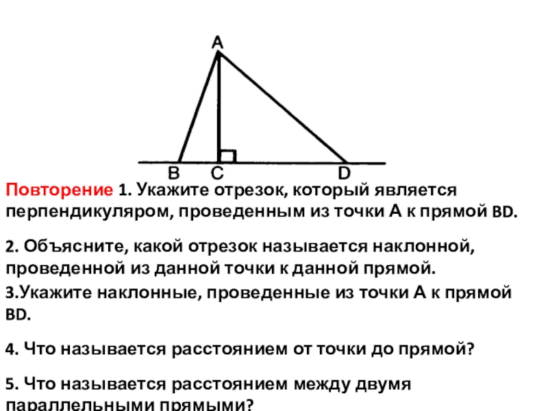 двумя параллельными прямыми?Повторение 1. Укажите отрезок, который является перпендикуляром, проведенным из точки А к прямой BD.