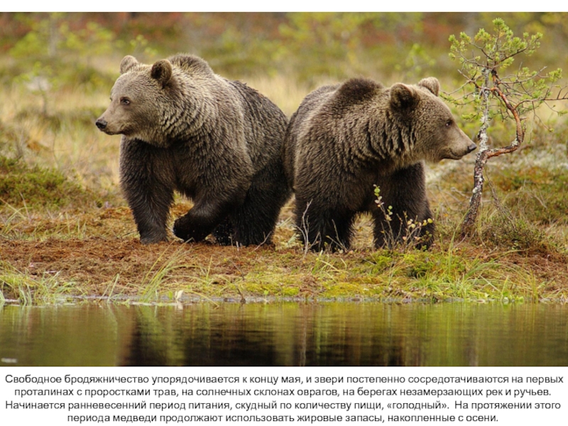 на берегах незамерзающих рек и ручьев. Начинается ранневесенний период питания, скудный по количеству пищи, «голодный». На протяжении этого периода медведи продолжают использовать жировые запасы, накопленные с осени.