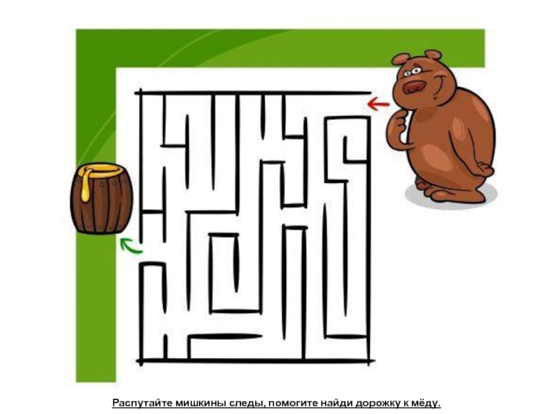 Слайд 26Распутайте мишкины следы, помогите найди дорожку к мёду.