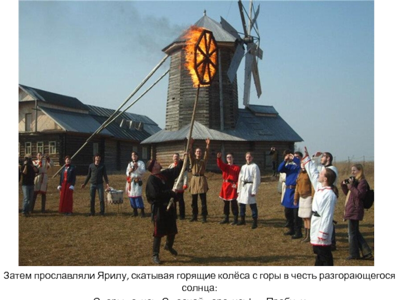 Слайд 8Затем прославляли Ярилу, скатывая горящие колёса с горы в честь