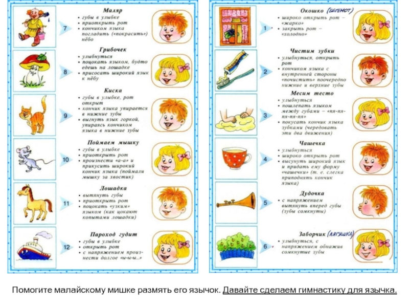 Слайд 29Помогите малайскому мишке размять его язычок. Давайте сделаем гимнастику для