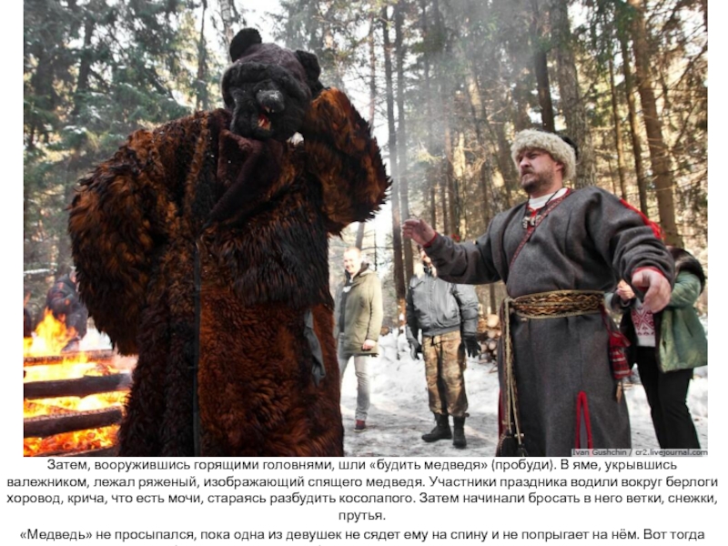 Слайд 9Затем, вооружившись горящими головнями, шли «будить медведя» (пробуди). В яме,