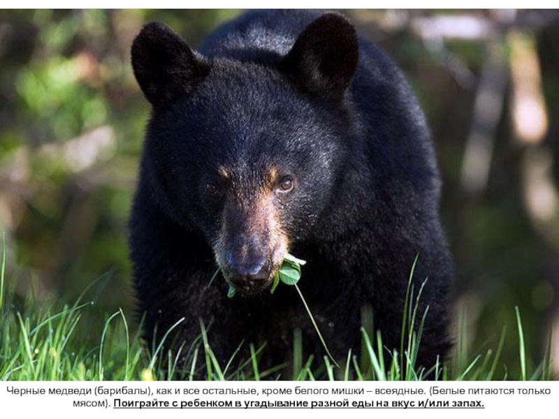 Слайд 23Черные медведи (барибалы), как и все остальные, кроме белого мишки