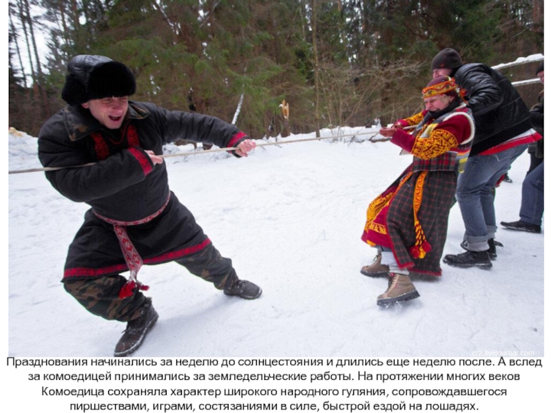протяжении многих веков Комоедица сохраняла характер широкого народного гуляния, сопровождавшегося пиршествами, играми, состязаниями в силе, быстрой ездой на лошадях.