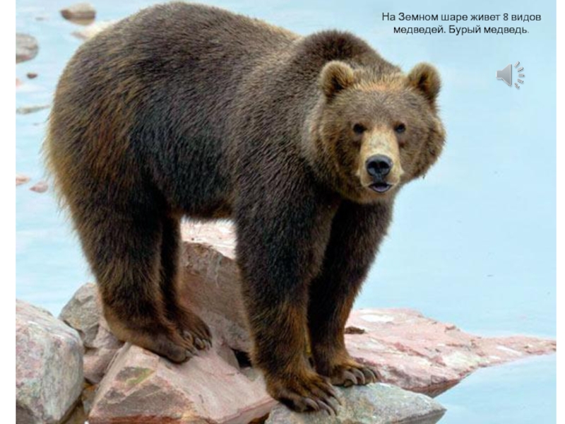 Слайд 17На Земном шаре живет 8 видов медведей. Бурый медведь.