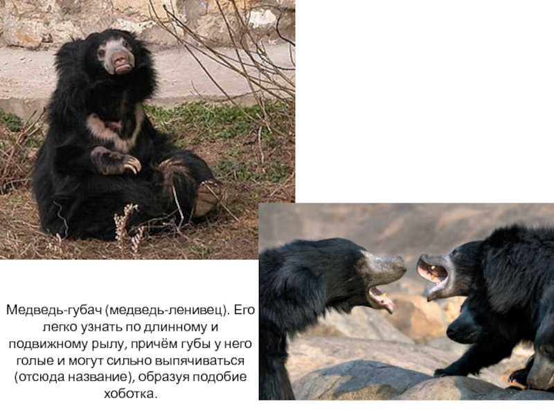 Слайд 30Медведь-губач (медведь-ленивец). Его легко узнать по длинному и подвижному рылу,