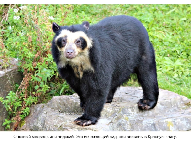 Слайд 32Очковый медведь или андский. Это исчезающий вид, они внесены в Красную