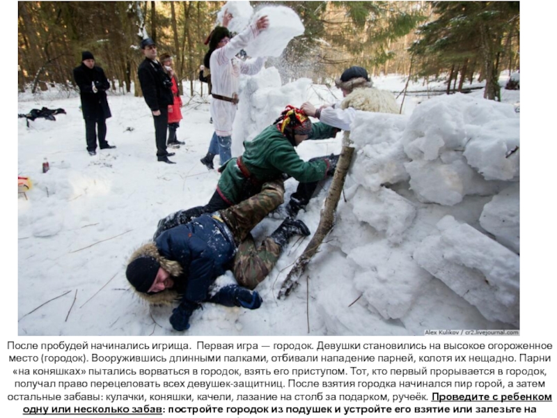 парней, колотя их нещадно. Парни «на коняшках» пытались ворваться в городок, взять его приступом. Тот, кто первый прорывается в городок, получал право перецеловать всех девушек-защитниц. После взятия городка начинался пир горой, а затем остальные забавы: кулачки, коняшки, качели, лазание на столб за подарком, ручеёк. Проведите с ребенком одну или несколько забав: постройте городок из подушек и устройте его взятие или залезьте на столб-канат за подарком…