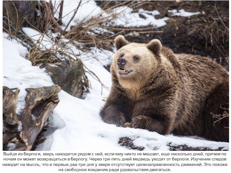 Слайд 14Выйдя из берлоги, зверь находится рядом с ней, если ему