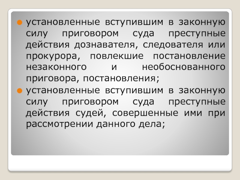 Слайд 7установленные вступившим в законную силу приговором суда преступные действия дознавателя,