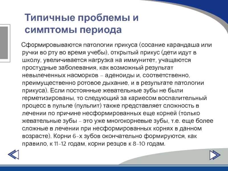 прикус (дети идут в школу, увеличивается нагрузка на иммунитет, учащаются простудные заболевания, как возможный результат невылеченных насморков – аденоиды и, соответственно, преимущественно ротовое дыхание, и в результате патологии прикуса). Если постоянные жевательные зубы не были герметизированы, то следующий за кариесом воспалительный процесс в пульпе (пульпит) также представляет сложность в лечении по причине несформированных еще корней (только жевательные зубы - это уже многокорневые зубы, т.е. еще более сложные в лечении при несформированных корнях в данном возрасте). Корни 6-х зубов окончательно формируются, как правило, к 11-12 годам, корни резцов к 8-10 годам.