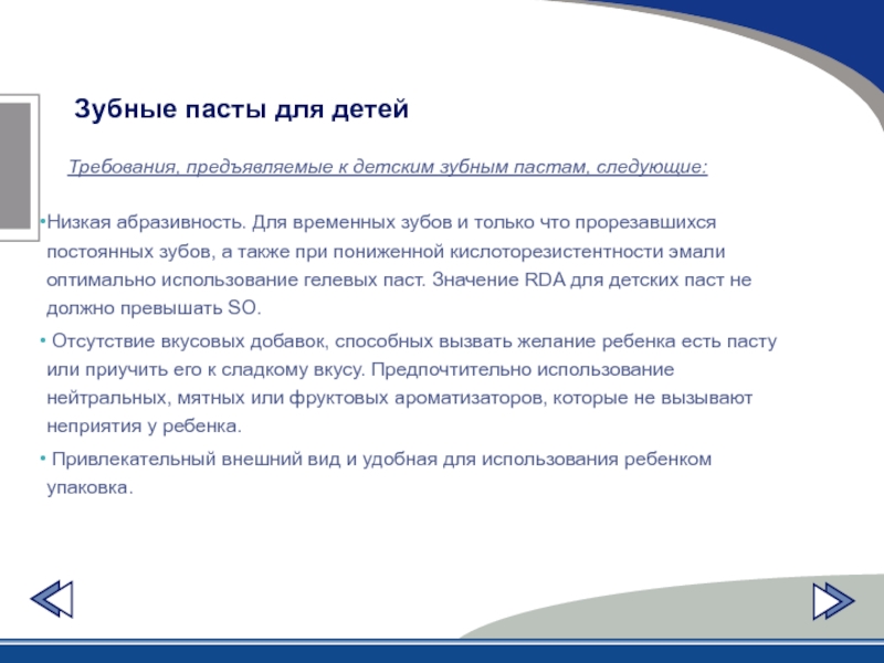 Требования, предъявляемые к детским зубным пастам, следующие: