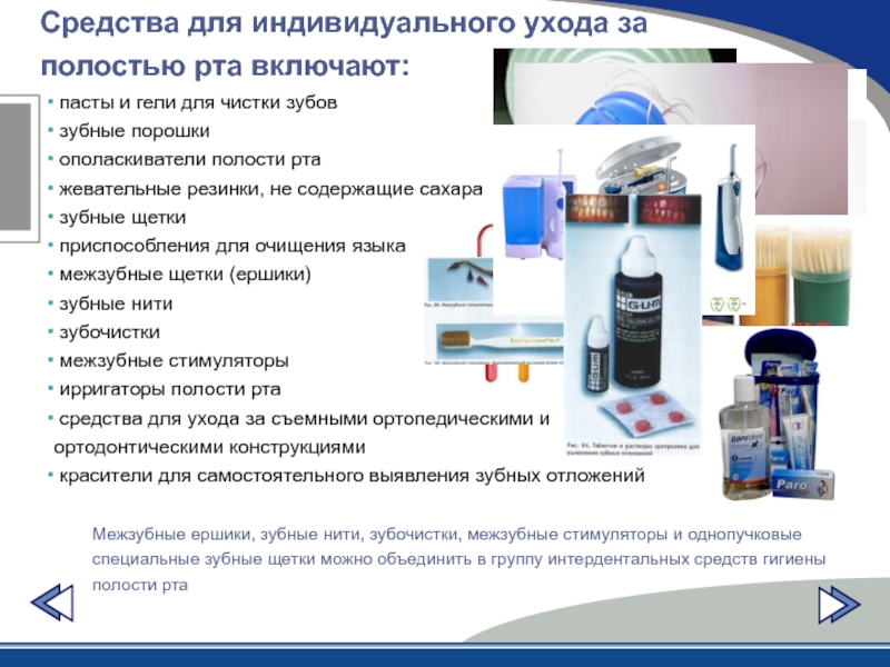 Средства для индивидуального ухода за полостью рта включают: