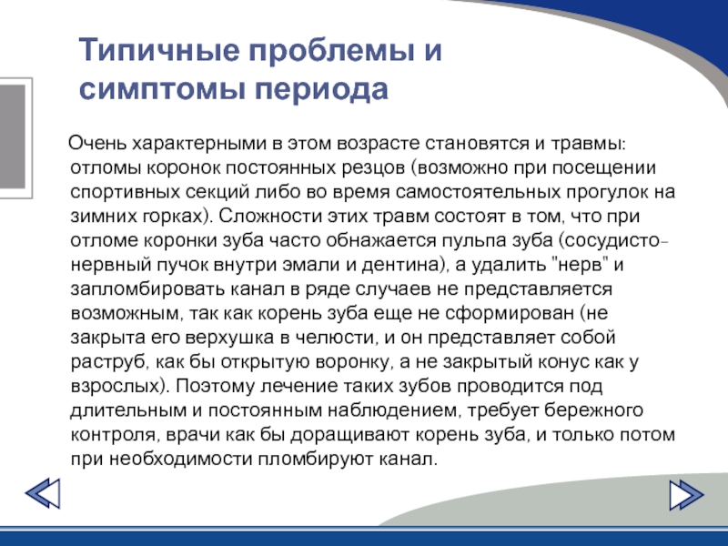 (возможно при посещении спортивных секций либо во время самостоятельных прогулок на зимних горках). Сложности этих травм состоят в том, что при отломе коронки зуба часто обнажается пульпа зуба (сосудисто-нервный пучок внутри эмали и дентина), а удалить "нерв" и запломбировать канал в ряде случаев не представляется возможным, так как корень зуба еще не сформирован (не закрыта его верхушка в челюсти, и он представляет собой раструб, как бы открытую воронку, а не закрытый конус как у взрослых). Поэтому лечение таких зубов проводится под длительным и постоянным наблюдением, требует бережного контроля, врачи как бы доращивают корень зуба, и только потом при необходимости пломбируют канал.