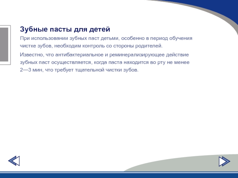 зубов, а также при пониженной кислоторезистентности эмали оптимально использование гелевых паст. Значение RDA для детских паст не должно превышать SO.