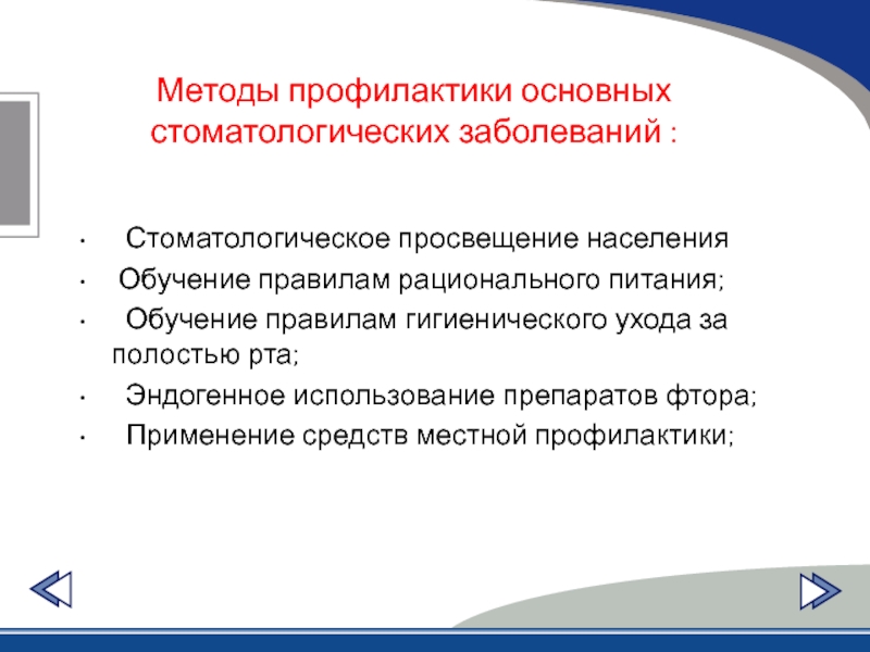 Слайд 3Методы профилактики основных стоматологических заболеваний :
