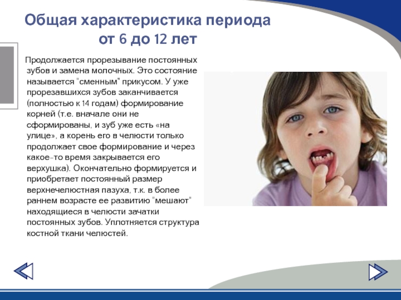 "сменным" прикусом. У уже прорезавшихся зубов заканчивается (полностью к 14 годам) формирование корней (т.е. вначале они не сформированы, и зуб уже есть «на улице», а корень его в челюсти только продолжает свое формирование и через какое-то время закрывается его верхушка). Окончательно формируется и приобретает постоянный размер верхнечелюстная пазуха, т.к. в более раннем возрасте ее развитию "мешают" находящиеся в челюсти зачатки постоянных зубов. Уплотняется структура костной ткани челюстей.