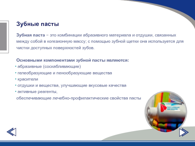 Слайд 11Зубная паста − это комбинации абразивного материала и отдушки, связанных
