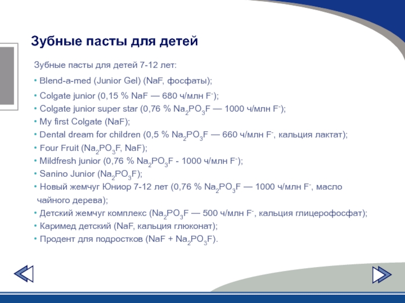 Слайд 42ФТОРСОДЕРЖАЩИЕ ЗУБНЫЕ ПАСТЫ ДЛЯ ДЕТЕЙ