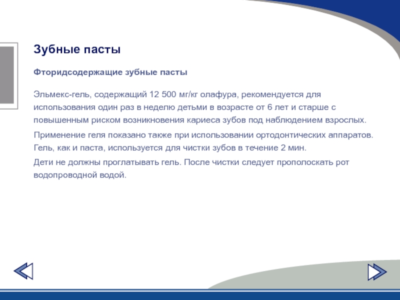 Применение геля показано также при использовании ортодонтических аппаратов. Гель, как и паста, используется для чистки зубов в течение 2 мин.