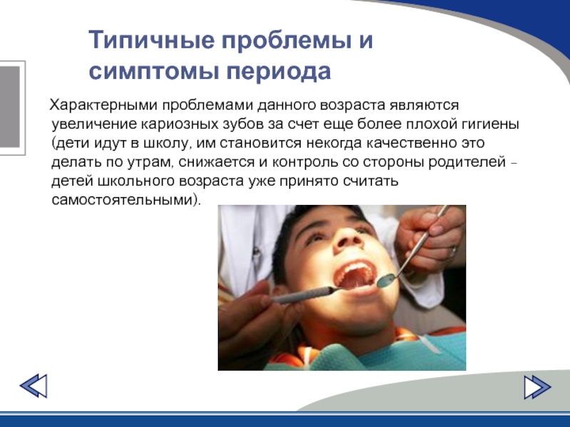 плохой гигиены (дети идут в школу, им становится некогда качественно это делать по утрам, снижается и контроль со стороны родителей - детей школьного возраста уже принято считать самостоятельными).