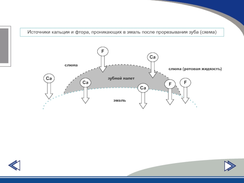 Слайд 43Источники кальция и фтора, проникающих в эмаль после прорезывания зуба