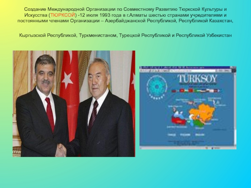 Слайд 27Создание Международной Организации по Совместному Развитию Тюркской Культуры и Искусства