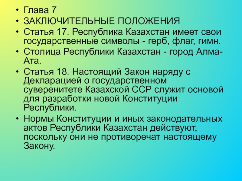18. Настоящий Закон наряду с Декларацией о государственном суверенитете Казахской ССР служит основой для разработки новой Конституции Республики.