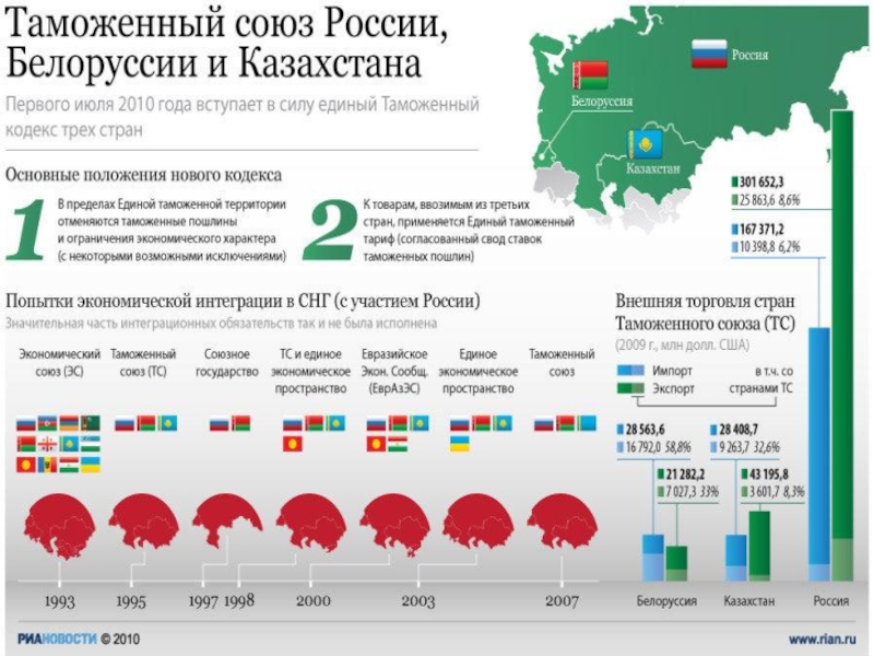 1 июля 2010 г. – Таможенный союз ,все внутренние границы фактически переносятся на внешние контуры границ Казахстана, России и Белоруссии.