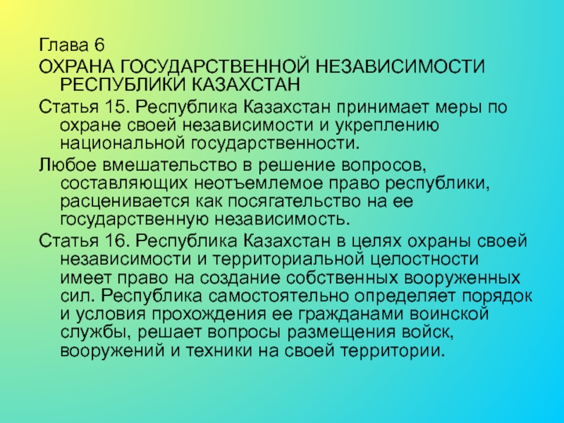 Статья 16. Республика Казахстан в целях охраны своей независимости и территориальной целостности имеет право на создание собственных вооруженных сил. Республика самостоятельно определяет порядок и условия прохождения ее гражданами воинской службы, решает вопросы размещения войск, вооружений и техники на своей территории.