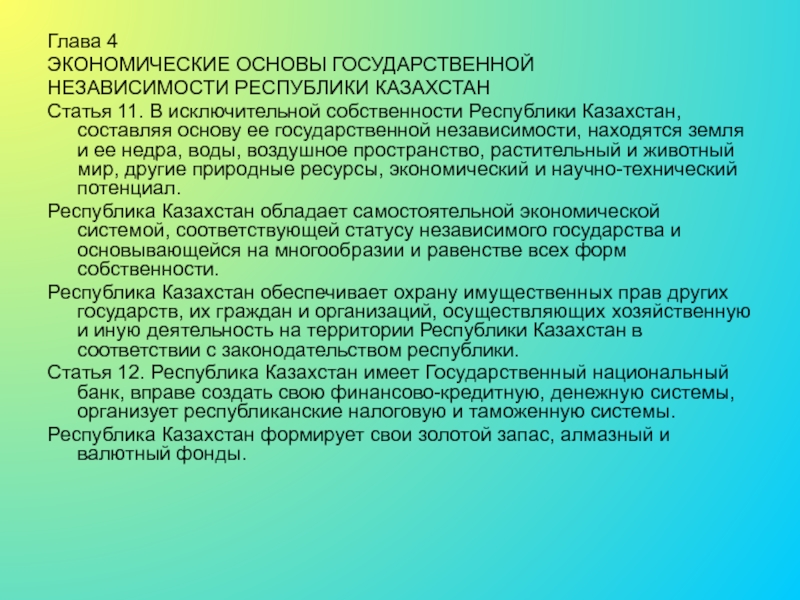 Статья 12. Республика Казахстан имеет Государственный национальный банк, вправе создать свою финансово-кредитную, денежную системы, организует республиканские налоговую и таможенную системы.