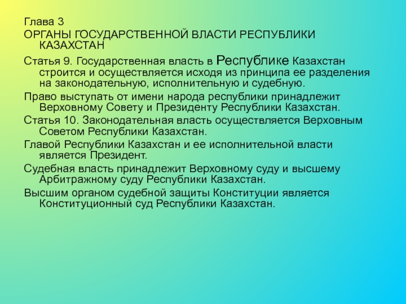 Статья 10. Законодательная власть осуществляется Верховным Советом Республики Казахстан.
