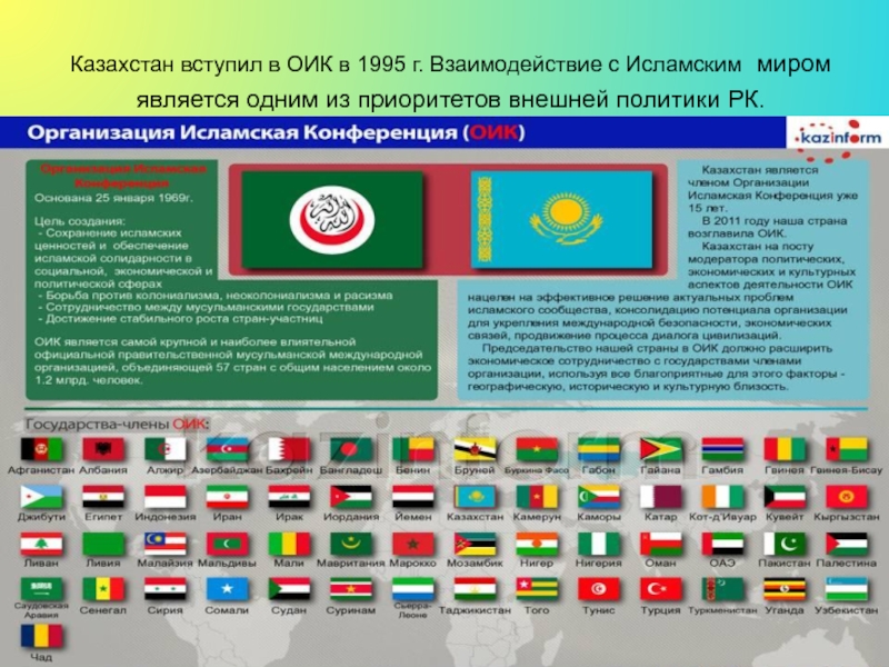 Слайд 25Казахстан вступил в ОИК в 1995 г. Взаимодействие с Исламским