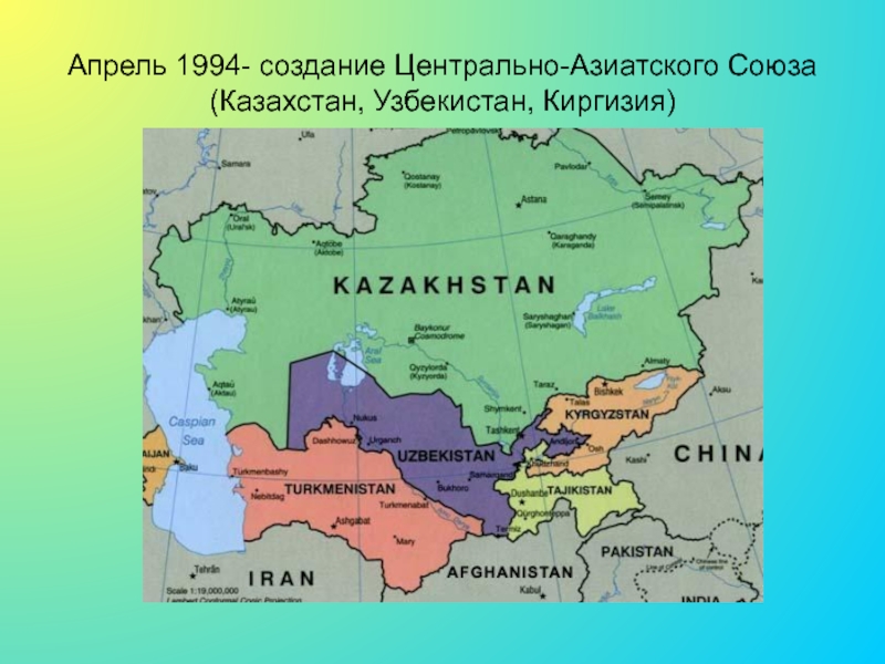 Слайд 24Апрель 1994- создание Центрально-Азиатского Союза(Казахстан, Узбекистан, Киргизия)