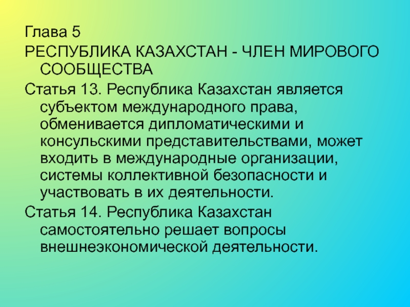 Статья 2. Республика Казахстан строит свои взаимоотношения со всеми государствами на принципах международного права.