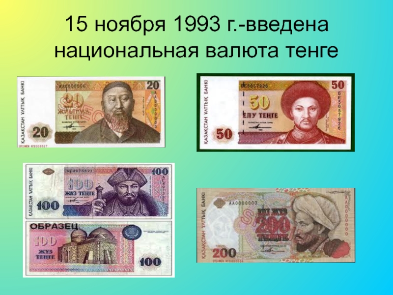 Слайд 1415 ноября 1993 г.-введена национальная валюта тенге