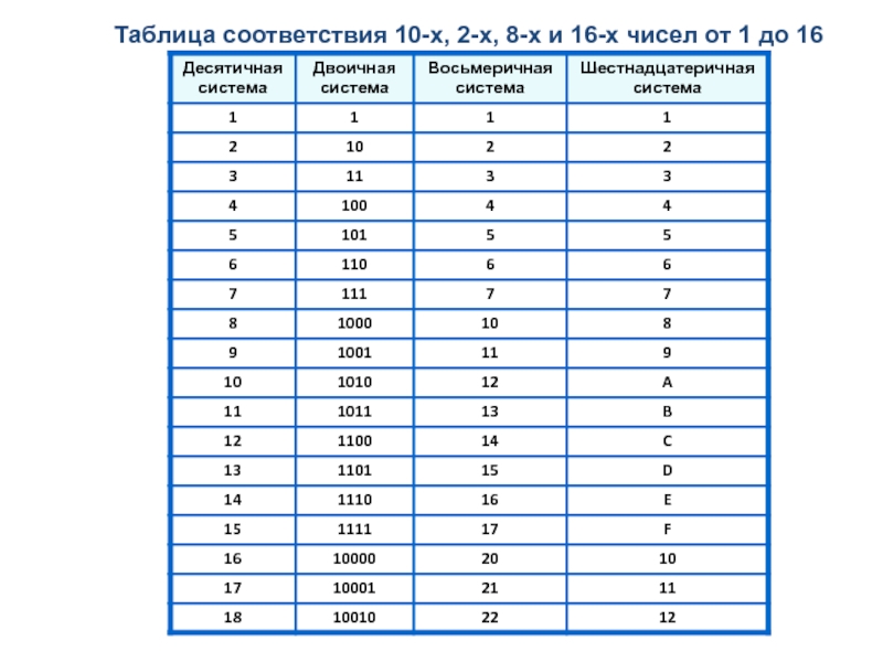 Заполните таблицу, в каждой строке которой одно и то же число должно быть записано в системах счисления с основаниями 2, 8, 10 и 16.