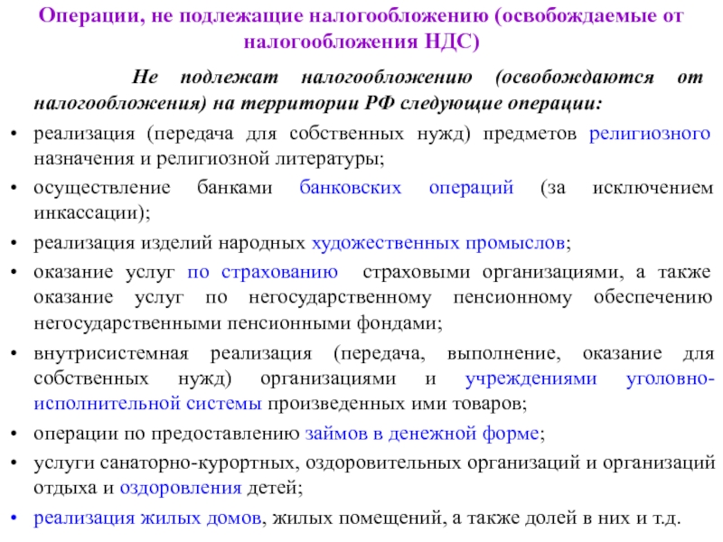 Слайд 16Операции, не подлежащие налогообложению (освобождаемые от налогообложения НДС)
